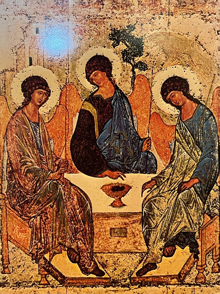 Después de la comida y siesta recetada por el doctor del alma, hemos pasado un tiempo en el Santuari leyendo. Mañana, último post de la serie, compartiremos los libros que nos han acompañado en esta jornada. La calma ha sido interrumpida por un grupo de deportistas jesuitas de los Estados Unidos que están de paso por aquí (también hay un grupo del Boston College y otro de Esade.) Su ruido (y también sus olores) han hecho que cambiemos de ubicación. Nos hemos instalado en una sala de oración adjunta al comedor en la que destacaba el cuadro de la Trinidad. Por cierto, el calendario litúrgico celebra mañana el domingo de la Santísima Trinidad. Hemos realizado una lectura contemplativa sobre el texto del centurión de Cafarnaún (Mateo 8:5-13) para acabar dialogando largo y tendido sobre los muchos que vendrán de oriente y occidente para sentarse a lo largo de la mesa.